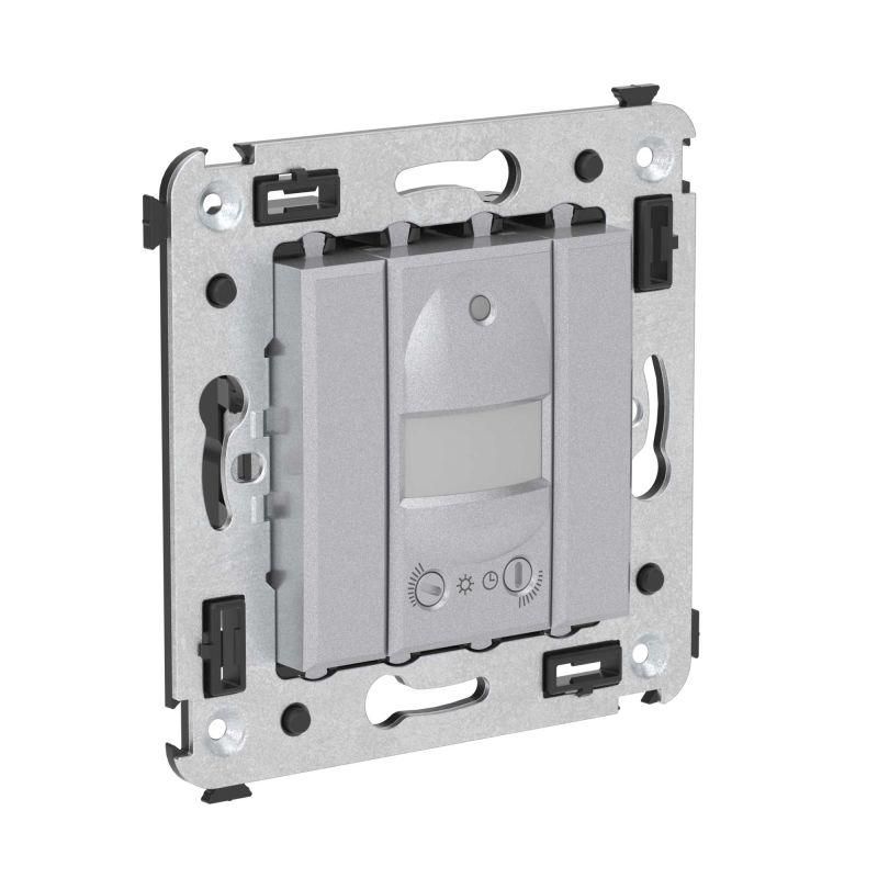 Датчик движения в стену, закаленная сталь, серия DKC, СП рассчитан на скрытую установку в подрозеточные коробки глубиной не менее 45 мм. Для фиксации используется специальный каркас с лапками (артикул 4400802) и саморезы - они обеспечивают прочную посадку даже в старых коробках. Кабели подключаются через винтовые зажимы, что исключает необходимость пайки. Устройство совместимо с выключателями лестничного освещения и работает с любыми типами ламп, включая энергосберегающие с электронными трансформаторами.