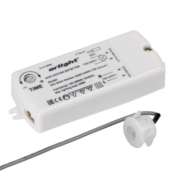 Датчик SR2-Motion (220V, 500W, PIR-Sensor) | 020223 Arlight - это бесконтактный ИК-выключатель ламп и освещения, который работает при напряжении 220 В. Он оснащен датчиком PIR, который реагирует на движение в радиусе до 2,5 метров. Когда датчик обнаруживает движение, он включает свет, а когда движения нет, он выключает его.