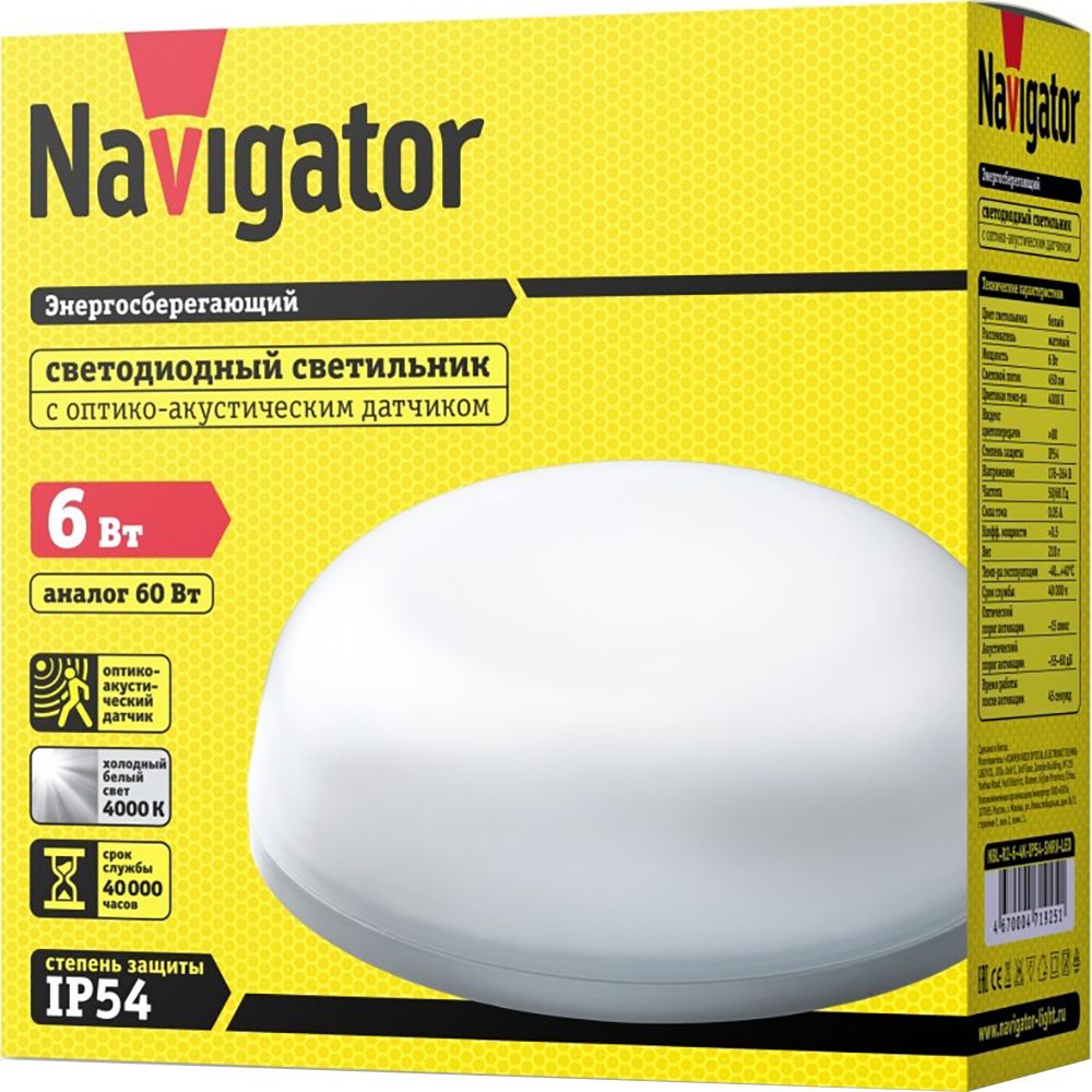 Светильник светодиодный 6Вт 4000К 450лм IP54 с оптико-акустическим датчиком круглый белый от бренда Navigator - это энергоэффективное решение для автоматического освещения помещений с непостоянным пребыванием людей. Модель артикула 71925 сочетает компактную форму, надежную защиту и умное управление светом через комбинированный датчик.