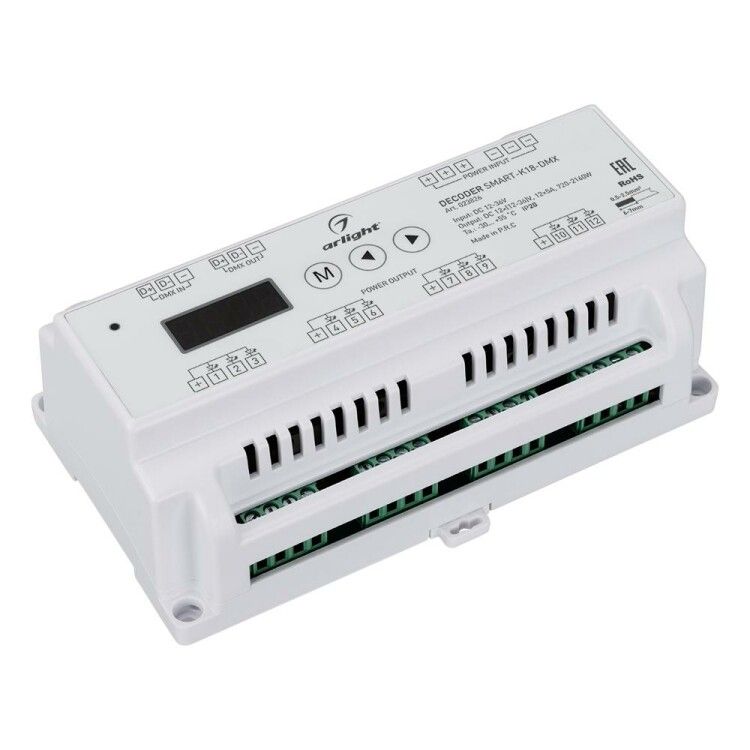 Декодер SMART-K18-DMX (12-36V, 12x5A) IP20 пластик от Arlight преобразует цифровой сигнал DMX512 в аналоговые импульсы ШИМ для управления светодиодными лентами и другими нагрузками. Устройство рассчитано на монтаж на DIN-рейку и подходит для систем освещения с питанием 12–36 В.