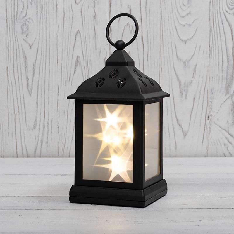 Декоративный фонарь 11х11х22,5 см, черный корпус, теплый белый цвет свечения с эффектом мерцания не требует проводки. Устанавливается на любую поверхность: подвешивается на цепочку, крючок или располагается на полке, столе, камине. Для запуска достаточно установить три батарейки AAA и нажать кнопку включения. Никаких инструментов или специальных знаний не требуется.