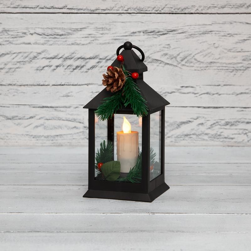 Декоративный фонарь со свечкой и шишкой, черный корпус, размер 10,7x10,7x23,5 см, цвет теплый белый | 513-047 NEON-NIGHT