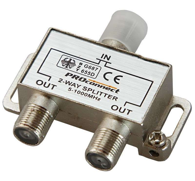 - Делитель ТВ х 2 под F-разъем 5–1000 МГц для эфирного телевидения от PROconnect (арт. 05-6021) - отличный выбор для базовых решений, но не для профессиональных сетей с длинными линиями.