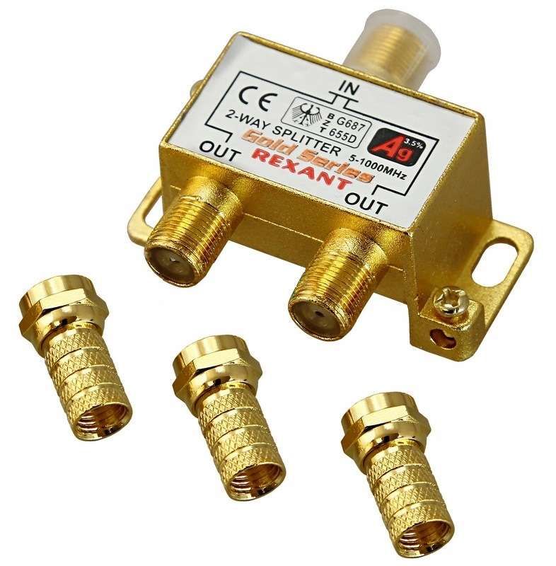 Делитель телевизионный краб x 2 + 3 шт. F-разъем BOX 5-1000 МГц GOLD от REXANT (артикулы 05-6101-1 и etm05-6101-1) - это надёжный двухвыходной разделитель сигнала для подключения двух телевизоров или приемников к одному коаксиальному кабелю от антенны. Устройство сохраняет качество сигнала благодаря металлическому корпусу и золотосодержащему припою.