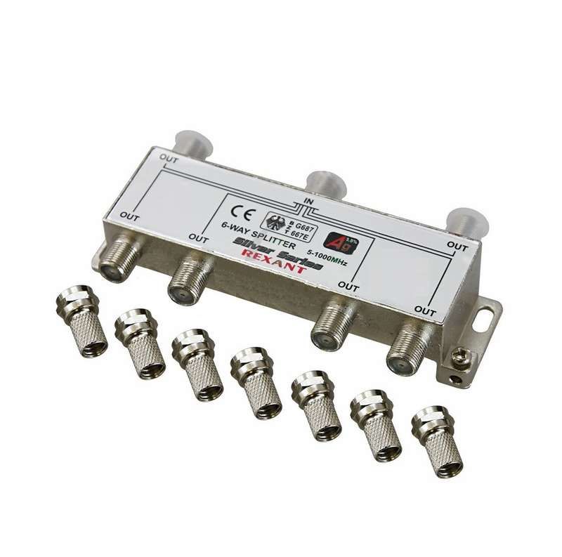 - Комплектация: 7 F-разъёмов (1 на вход, 6 на выходы)
