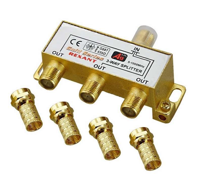 Делитель телевизионный х 3 + 4 шт. F-разъем BOX 5-1000 МГц GOLD от REXANT (артикул 05-6102-1) - это надёжный трёхвыходной разделитель сигнала для распределения TV-сигнала от одной антенны между несколькими телевизорами. Подходит для бытовых и профессиональных установок в жилых помещениях.