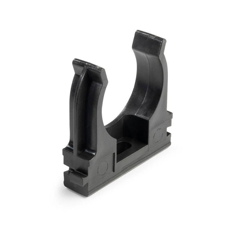 Клипса-крепеж 32 черная предназначена для надежной фixации труб и рукавов диаметром около 32 мм. Подходит для крепления на горизонтальных и вертикальных поверхностях: стены, панели, рамы, щиты. Часто используется в системах управления, на станках, конвейерах, в шкафах автоматики и при прокладке кабельных трасс внутри зданий.
