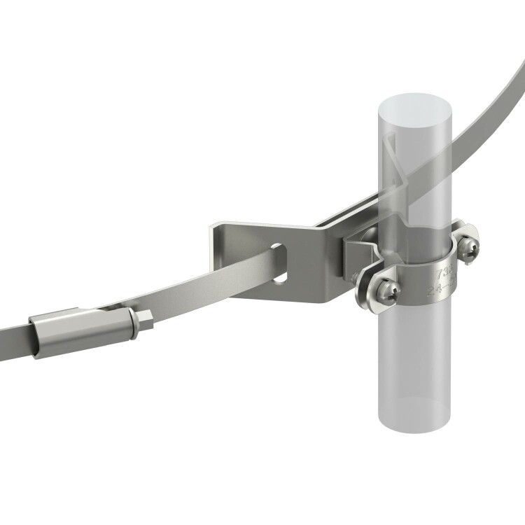 Держатель isCon HS 26 VA совместим с токоотводами серии isCon® от OBO BETTERMANN. Для установки используется натяжная лента длиной 2 м, которая продается отдельно. Монтаж выполняется путём обхвата трубы хомутом и затяжки лентой - не требует сверления или болтов. Подходит для труб диаметром до 90 мм. Убедитесь, что поверхность трубы чистая и свободна от краски или оксидов перед установкой.