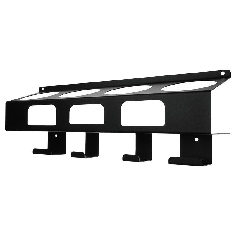 Основная часть держателя выполнена из прочной стали с антикоррозийным покрытием черного цвета. Шесть углублений обеспечивают устойчивую посадку баллончиков, исключая их случайное падение. Четыре выступающих крючка позволяют повесить перчатки, очки, халаты или длинные инструменты. Конструкция не требует сборки - изделие готово к использованию сразу после крепления на стену.