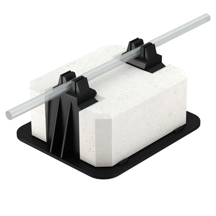 Держатель проволоки для плоской кровли 165 R-8-10 совместим со всеми стандартными проводниками диаметром 8–10 мм - как одножильными, так и многожильными. Хомут защелкивается одним движением, не требует инструментов. Бетонное основание устанавливается на поверхность кровли с помощью анкеров или клеящего состава, подходящего для бетона. После затвердевания раствора можно закрепить проводник. Разборная конструкция позволяет заменить поврежденную часть без удаления всего держателя.