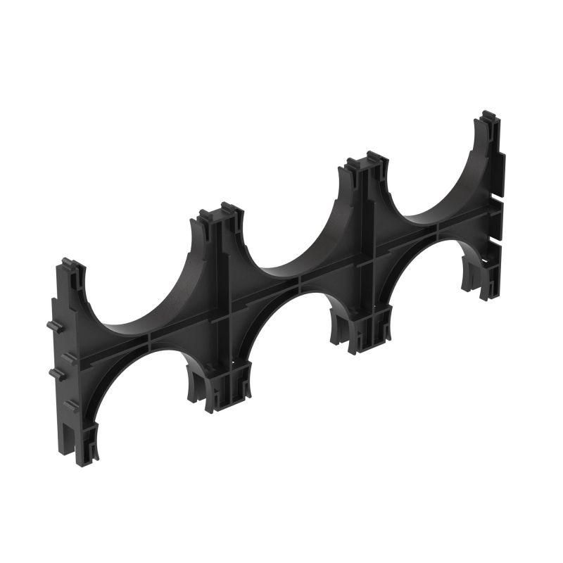 Держатель расстояния (кластер) тройной для двустенных труб с фиксацией, диаметр 110 мм имеет пазы, точно соответствующие внешнему контуру труб 110 мм. Каждый паз предотвращает проскальзывание и перекос труб. Конструкция оснащена защелками на боковых поверхностях - позволяют соединять несколько держателей друг с другом для формирования длинных блоков из нескольких рядов труб. Монтаж выполняется вручную: достаточно поместить трубы в пазы и зафиксировать держатель на основании (например, на песчаной подушке, бетонной плите или в опалубке). Нет необходимости в дополнительных крепежах - вес труб и собственная жесткость конструкции обеспечивают устойчивость.