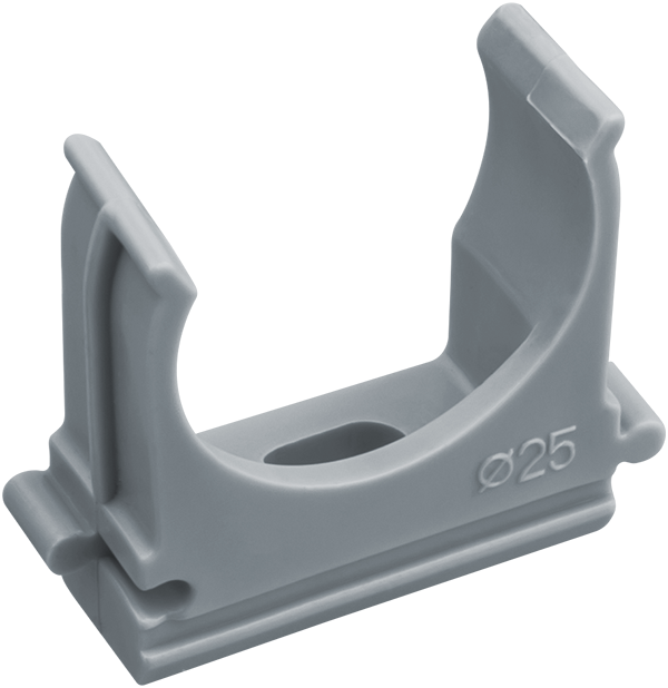 Держатель для труб с защелкой d25мм 61 230 NCR-T-25-B100 совместим с любыми трубами и рукавами, имеющими внешний диаметр до 25 мм. Для установки требуется предварительно просверлить отверстие под крепёж (диаметр отверстия зависит от используемых саморезов/дюбелей). Крепление осуществляется через два выступающих ушка на корпусе. Боковая защелка позволяет легко соединять соседние держатели - даже разных диаметров - без дополнительных элементов. Монтаж возможен на дерево, ГКЛ, бетон, металлические профили и другие прочные основания.