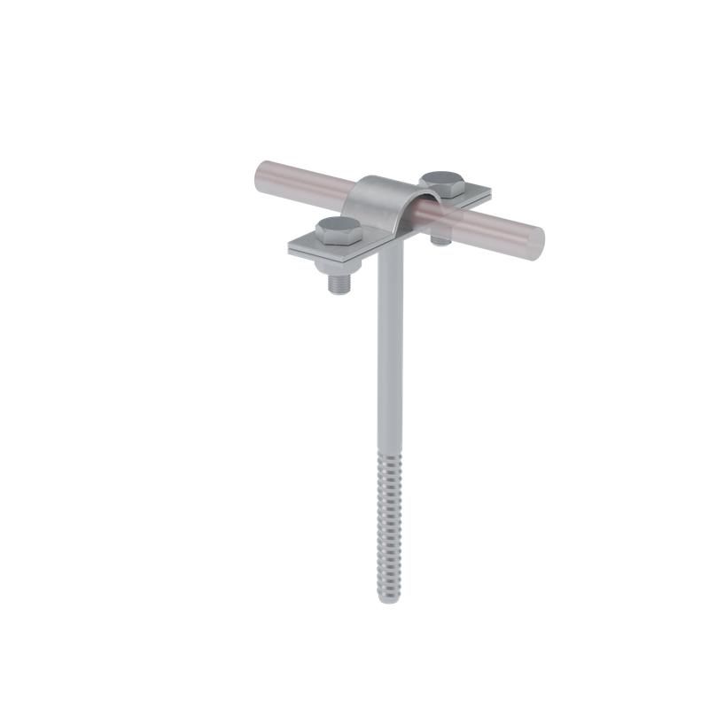 Держатель совместим с круглыми стальными прутками диаметром 5–10 мм, используемыми в качестве вертикальных токоотводов. Для монтажа необходимо просверлить отверстие в основе под шпильку держателя, вставить изделие и закрутить гайкой. Затем пруток вставляется между профилированными пластинами и фиксируется двумя болтами М5×12. Рекомендуется использовать шайбы и анкерные элементы подходящего типа для обеспечения плотного контакта с основанием. Не требует сварки или специального оборудования.