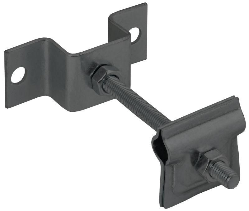 Держатель-зажим используется для крепления круглых проводников диаметром 6–10 мм в системах заземления. Подходит для установки на мостовые опоры, стеновые поверхности и другие жёсткие основания. Может применяться как натяжитель или соединитель для прутковых заземлителей. Часто встречается в электроустановках подстанций, промышленных цехах, трансформаторных пунктах и на линиях электропередачи.