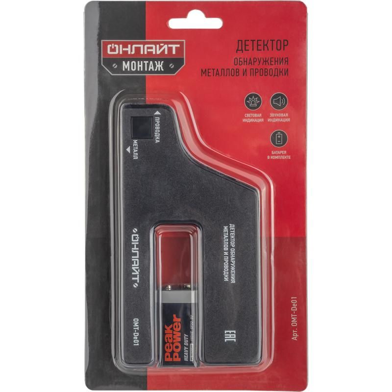 Детектор скрытой проводки 90 233 OMT-De01 от бренда ОНЛАЙТ - компактный прибор для точного обнаружения скрытых электрических кабелей и металлических объектов в стенах, потолках и полу. Подходит для работ на этапе сверления, штробления и ремонта интерьеров.