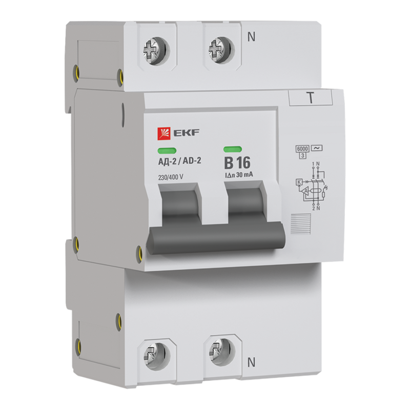 Дифференциальный автомат АД-2 16А/30мА характеристика B AC 6кА (электронный) ГСИ, ГСИ(н) от бренда EKF в серии PROxima - это комбинированное устройство, сочетающее функции автоматического выключателя и устройства защитного отключения (УЗО). Он защищает человека от удара током, предотвращает пожары из-за утечек и обеспечивает отключение при перегрузках и КЗ в бытовых и промышленных сетях 230 В.