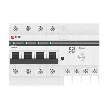 Автоматический выключатель дифференциального тока АД-4 25А/300мА (характеристика C, AC, электронный, защита 270В) 6кА от EKF PROxima сочетает защиту от утечек тока, перегрузок и коротких замыканий в одном корпусе. Подходит для установки в распределительных щитах жилых, общественных и промышленных объектов.
