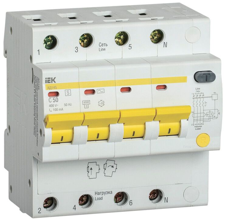 Автоматический дифференциальный выключатель IEK (ИЭК) АД14S - устройство для защиты людей и оборудования от поражения током и возгораний из-за утечек тока в сетях переменного тока. Подходит для установки в распределительных щитах жилых, общественных и промышленных объектах. Артикул mad13-4-050-c-100 соответствует модели с номиналом 50 А и чувствительностью 100 мА.