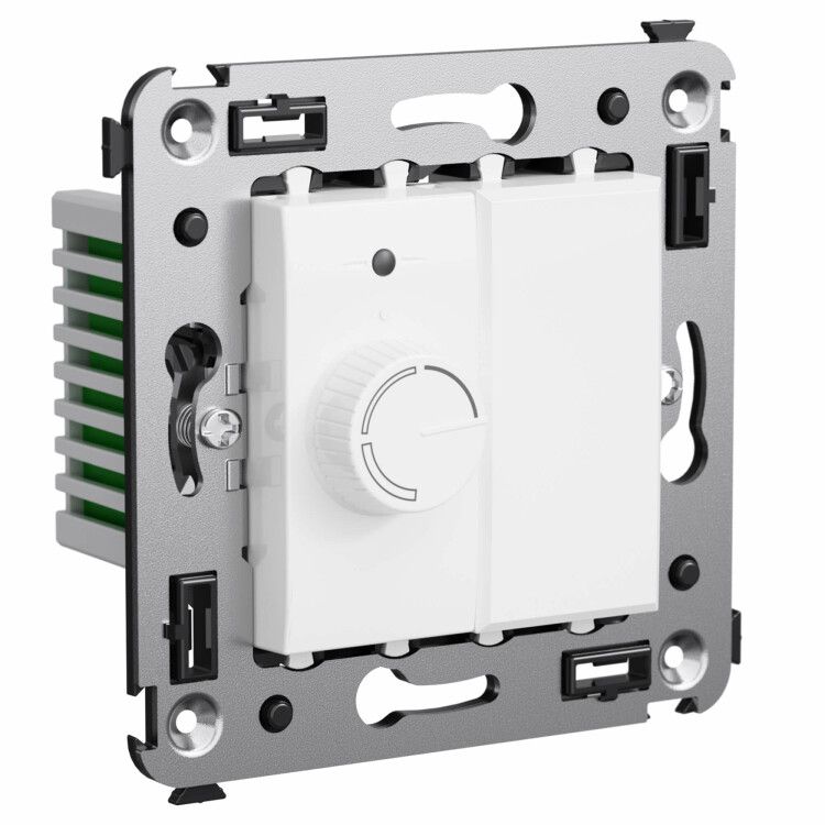 Диммер поворотный в стену, белое облако, DKC используется для контроля уровня освещённости в помещениях с помощью поворотного колесика. Подходит для управления лампами с совместимой нагрузкой - в первую очередь, светодиодными и галогенными источниками света. Устройство устанавливается вместо обычного выключателя и идеально вписывается в системы автоматизации жилья, офисов, ресторанов и гостиниц.