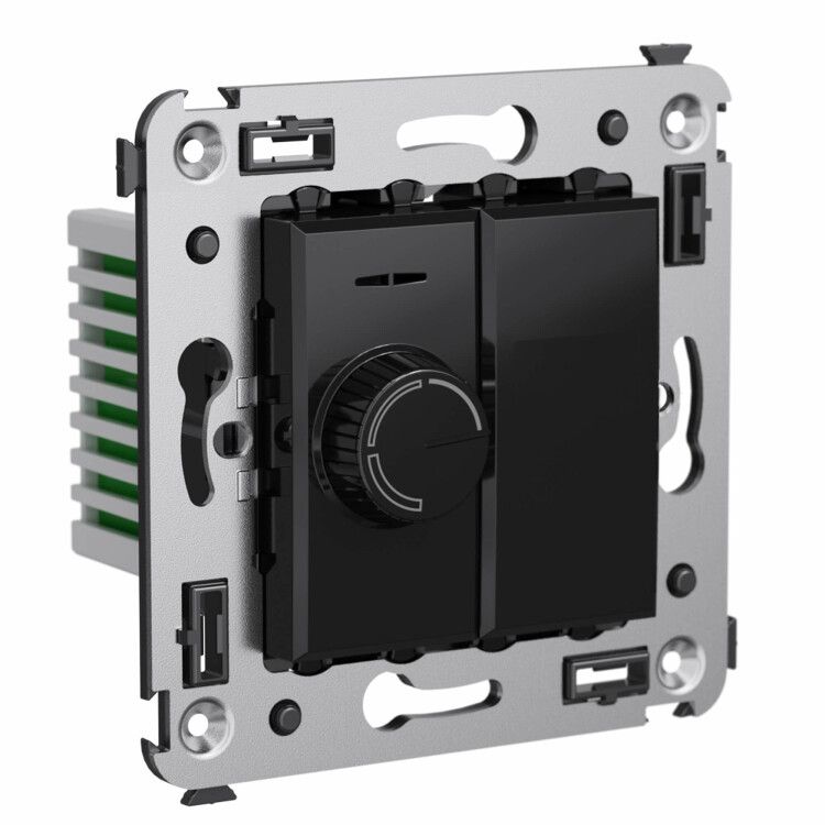 Диммер поворотный скрытого монтажа "Черный квадрат" DKC совместим с любыми клавишными выключателями серии Avanti, что позволяет собирать единые панели управления. Для монтажа требуется стандартная металлическая или пластиковая монтажная коробка глубиной не менее 45 мм. Крепление осуществляется двумя винтами через боковые отверстия. Перед установкой необходимо отключить питание. Обязательно проверьте совместимость нагрузки - устройство не рассчитано на индуктивные или высокочастотные нагрузки (например, некоторые драйверы LED с импульсным питанием).