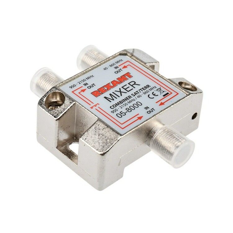Диплексор (сумматор-делитель) SAT+TV в усиленном корпусе от REXANT (арт. 05-8000) предназначен для совмещения и разделения спутникового и телевизионного сигналов через один коаксиальный кабель, что упрощает монтаж в многоквартирных домах и на объектах с ограниченным доступом.