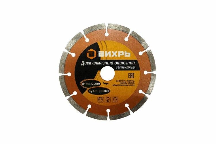 Диск алмазный отрезной сегментный 150х22,2 мм сухая резка от бренда Вихрь предназначен для точной и быстрой резки твёрдых материалов без охлаждения водой. Подходит для работы с болгарками на стройплощадках, в мастерских и при ремонте.