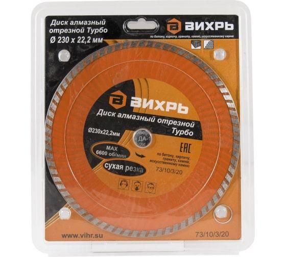 | Диск алмазный отрезной Турбо 230 х 22,2 мм, сухая резка | 73/10/3/20 | ВИХРЬ | 24.02.2026 | 14 шт. | 1 011,86 ₽ | шт. | от 30 дней |