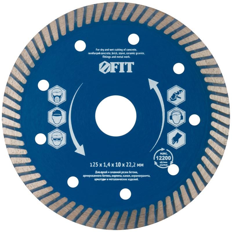 Диск отрезной алмазный универсальный Армобетон турбо сухой и мокрый рез 125х1.4х10х22.2 мм - 37347 FIT - это универсальный инструмент, предназначенный для резки различных материалов, таких как бетон, кирпич, гранит, керамогранит, мрамор и камень.