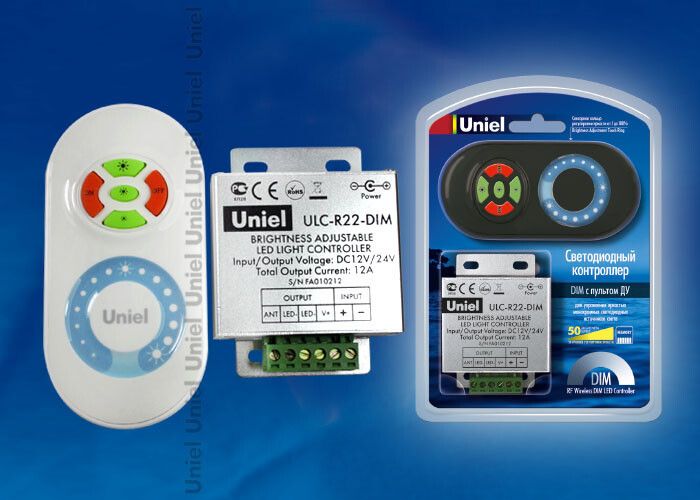 Контроллер для управления яркостью одноцветных светодиодных источников света ULC-R22-DIM от Uniel позволяет плавно регулировать уровень освещённости через пульт дистанционного управления. Устройство предназначено для работы с одноцветными LED-лентами и модулями, совместимо с большинством драйверов на 12–24 В постоянного тока.