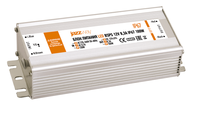 Драйвер светодиодный 100Вт 12В 8.3А IP67 влагозащищенный металлический BSPS - это надёжный источник питания для светодиодных лент и модулей, рассчитанный на работу в условиях повышенной влажности и пыли. Бренд JazzWay и артикул 3329280a указывают на серию BSPS, предназначенную для стационарного монтажа в промышленных и уличных системах освещения.