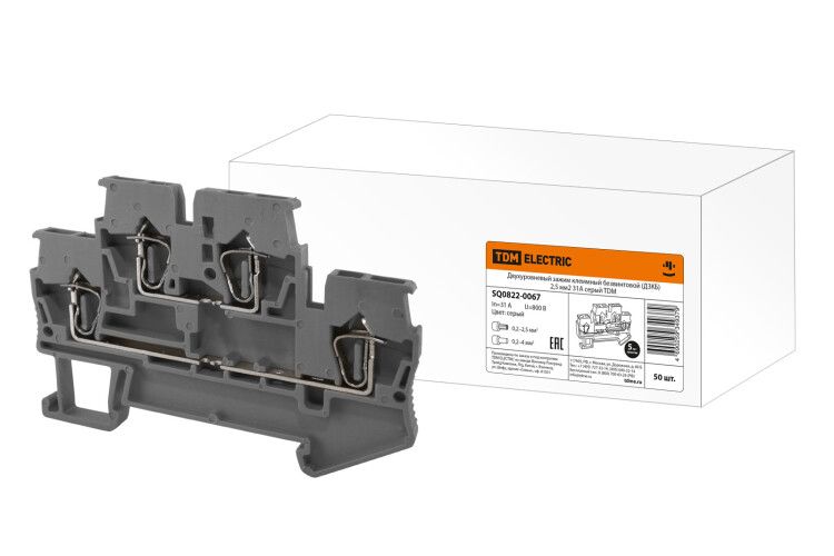 Двухуровневый зажим клеммный безвинтовой (ДЗКБ) 2,5 мм2 31А серый от TDM ELECTRIC - надёжное соединение проводов без инструментов, предназначен для монтажа в распределительных шкафах и технологическом оборудовании. Артикул sq0822-0067 обеспечивает плотный контакт за счёт пружинного механизма, исключающего необходимость затяжки винтов.