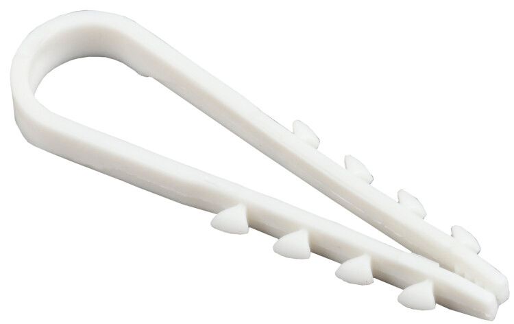 Устанавливается в просверленное отверстие диаметром 6 мм и глубиной 25 мм. Для монтажа достаточно вставить дюбель-хомут в отверстие и слегка ударить по нему молотком до упора. Кабель или трубка заводятся в паз хомута и фиксируются за счет эластичности материала. Не требует дополнительных крепежей - ни шурупов, ни болтов. Совместим со всеми типами плотных оснований: бетон, кирпич, камень. Не рекомендован для использования в гипсокартоне, пеноблоке или древесине - материал слишком мягкий для втычного крепления.
