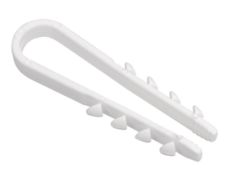 Дюбель-хомут IEK 19-25 мм нейлон белый устанавливается в отверстие диаметром 6 мм, просверленное на глубину 36 мм. После введения в отверстие он самоблокируется за счёт упругости нейлона. Кабель или рукав заводится внутрь хомута и фиксируется плотно, без дополнительного затягивания. Для монтажа нужны только перфоратор и сверло 6 мм - никаких шурупов, гаек или болтов не требуется. Упаковка содержит 100 единиц - удобно для крупных объектов.
