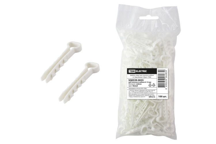 Дюбель-хомут для плоского кабеля 6–14 мм белый (100 шт) от TDM ELECTRIC - надёжный крепёж для фиксации плоских кабелей, гофрированных и жёстких труб на вертикальных и горизонтальных поверхностях. Артикул sq0539-0035 рассчитан на массовое использование в бытовых и промышленных системах проводки.