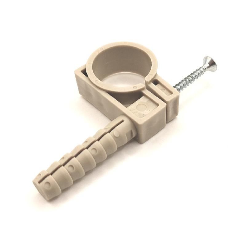 Дюбель-хомут крепление для труб 25 мм RTP совместим с трубами внешним диаметром 24–26 мм. Для установки требуется просверлить отверстие в основании (бетон, кирпич, газоблок) подходящего диаметра под дюбель (обычно 6–8 мм). Хомут плотно обхватывает трубу, а дюбель фиксирует весь элемент в стене. Установка выполняется обычными ручными инструментами: дрель, шуруповёрт, отвёртка. Не требует специальных крепёжных деталей - всё включено в один компонент.