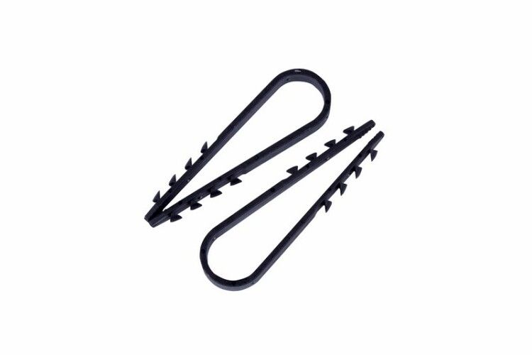 Дюбель-хомут нейлоновый 11-18 мм устанавливается путём вдавливания в просверленное отверстие. Для надёжной фиксации требуется отверстие диаметром 8–9 мм - точно соответствует размеру шипов. Использование затупленной или изношенной сверла снижает качество крепления. После вставки хомут плотно фиксируется за счёт боковых шипов, которые деформируются внутри материала. Кабель заводится в петлю и затягивается руками - никаких инструментов не требуется. Хомут совместим со всеми типами силовых и слаботочных кабелей, включая медные и оптоволоконные.