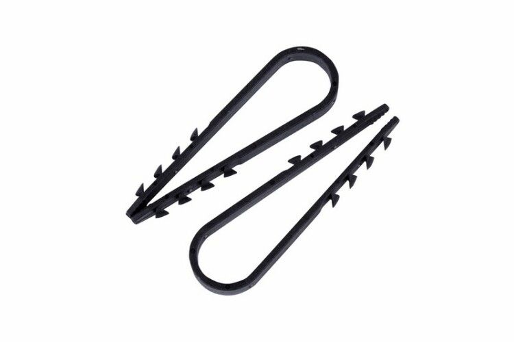 Дюбель-хомут нейлоновый 19-25 мм устанавливается в отверстие диаметром 8–10 мм, просверленное в бетоне, кирпиче, газоблоке, древесине или натуральном камне. Для надёжной фиксации важно точно соблюсти размер отверстия - слишком маленькое затруднит ввод, слишком большое снижает удерживающую силу. Кабель помещается внутрь петли, затем весь дюбель-хомут вдавливается в отверстие до упора. Шипы на боках обеспечивают самоблокировку - извлечение требует значительного усилия. Новая сверлильная оснастка обязательна: изношенное сверло даёт некорректный диаметр отверстия.