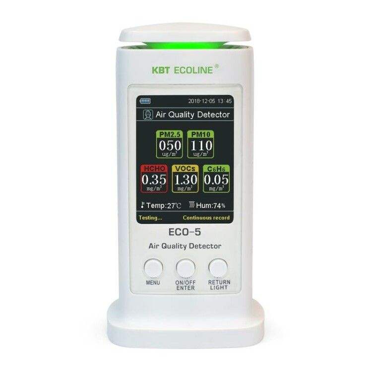Анализатор воздуха ECO-5 "ECOLINE" - это устройство, предназначенное для определения содержания вредных веществ в воздухе. Он осуществляет измерения таких параметров, как мелкодисперсная пыль PM2.5 и PM10, формальдегид, летучие органические вещества (TVOC/VOCs) и бензол.