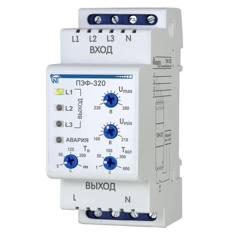 - Защита: обрыв фазы, перенапряжение (>280 В), пониженное напряжение (<160 В)