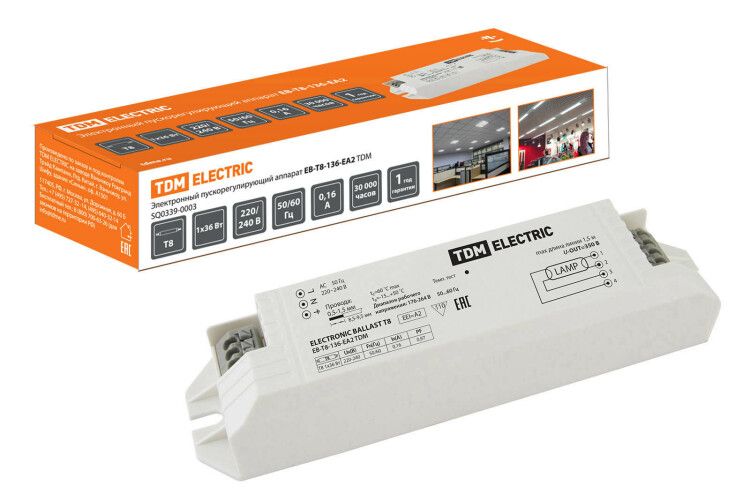 ЭПРА EB-T8-136-EA2 | SQ0339-0003 TDM ELECTRIC - это электронный пуско-регулирующий аппарат, предназначенный для использования с линейными люминесцентными лампами с колбой Т8 (T26).