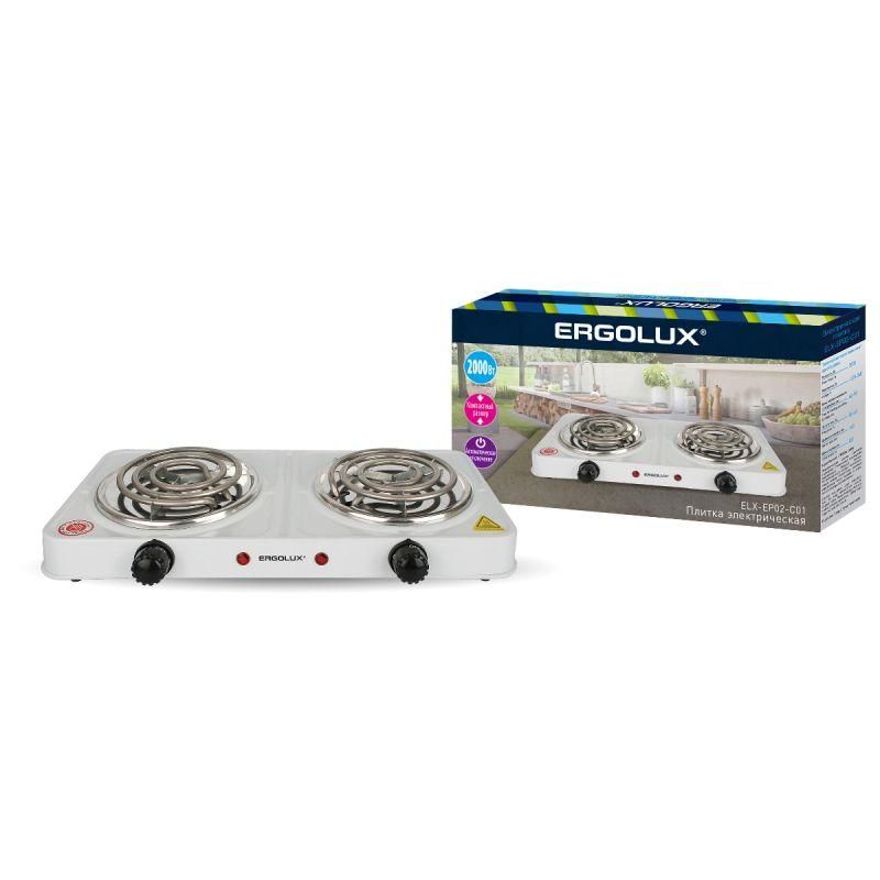 Электроплитка Ergolux 13437 - компактное двухконфорочное устройство с двумя спиральными нагревательными элементами на 2000 Вт, предназначенное для быстрого разогрева и приготовления пищи в условиях ограниченного пространства: офисах, магазинах, частных домах и производственных кухнях.