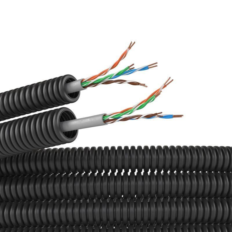Электротруба ПНД гибкая гофрированная диаметр 16 мм, цвет черный, с кабелем витая пара 5EU/UTP нг(А)-HF, длина 100 м предназначена для скрытой прокладки в штробах, стяжках полов, опалубке при монолитном строительстве. Подходит для передачи данных в локальных сетях - IP-камерах, телефонии, системах автоматизации, терминалах доступа. Кабель внутри не требует дополнительной протяжки, что снижает риск повреждений и ускоряет монтаж.