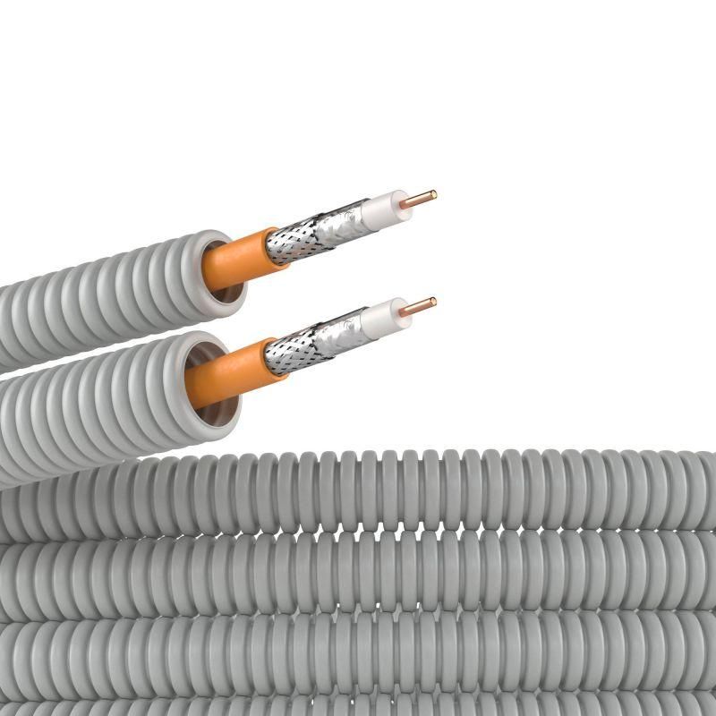 Электротруба ПВХ гибкая гофрированная d20мм с кабелем SAT нг(А)-HF, 25м от DKC (ДКС) - готовое решение для быстрой прокладки коаксиального кабеля в стенах, потолках и полу. Артикул 9ve92025 сочетает защищённую трубу и уже установленный кабель, исключая необходимость самостоятельной протяжки.
