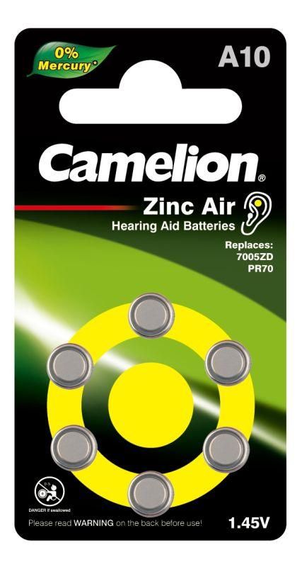 Элемент питания Camelion A10-BP6 (0%Hg) - воздушно-цинковая батарейка на 1,4 В и ёмкостью 90 мА·ч, предназначенная исключительно для работы в слуховых аппаратах. Упакованы по 6 штук в блистер, полностью лишены ртути и соответствуют требованиям экологической безопасности.