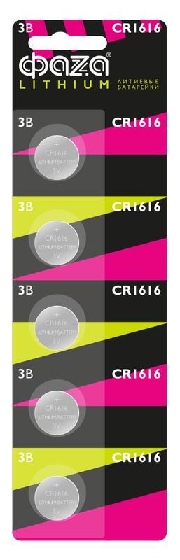Элемент питания литиевый CR1616 3В 5 штук в блистере от бренда ФАZA (ФАЗА) - компактная кнопочная батарейка с высокой плотностью энергии, предназначенная для питания малогабаритных устройств. Артикул 5027916 соответствует сериям Litium и подходит для замены износившихся элементов в бытовой электронике.