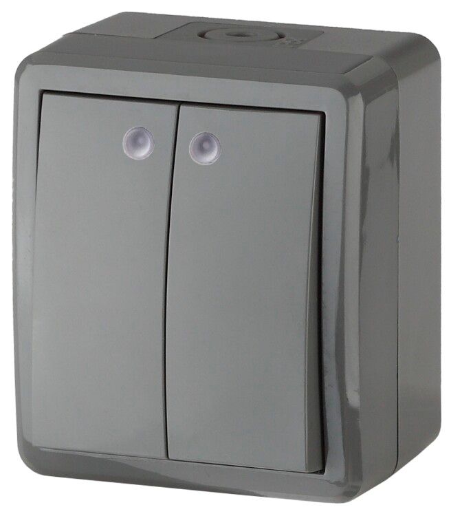 Выключатель двухклавишный наружный (открытой установки) с подсветкой IP54 серый 10А 250В винтовые зажимы ЭРА Эксперт 11-1405-03 - Б0020678