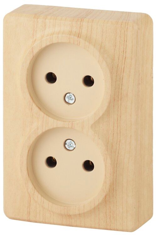 Розетка Эра Эксперт с артикулом Б0020684 - двухместная силовая розетка для открытого монтажа, рассчитанная на ток 16 А и напряжение 250 В. Материал корпуса - термопласт, имитирующий фактуру сосны, с механической защитой от доступа детей. Подходит для помещений, где невозможно или нецелесообразно устанавливать подрозетники - например, в деревянных домах, ангарах, мастерских или временных сооружениях.