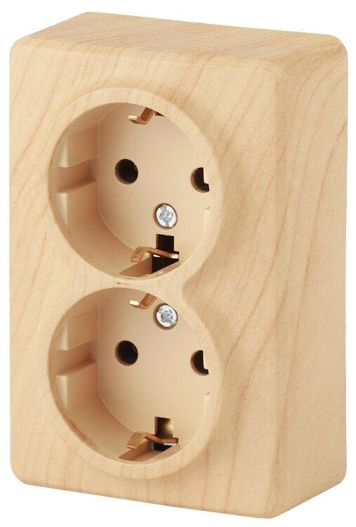 Розетка 2-местная с заземлением 16А 250В Schuko открытого монтажа сосна используется там, где требуются простой и быстрый монтаж без штробления стен. Подходит для установки на деревянные, металлические или пластиковые поверхности - в мастерских, гаражах, временных помещениях, на дачах, в административных зданиях с открытой проводкой. Применяется для питания оборудования мощностью до 3,5 кВт: сварочных аппаратов, компрессоров, электроинструментов, освещения, бытовой техники.