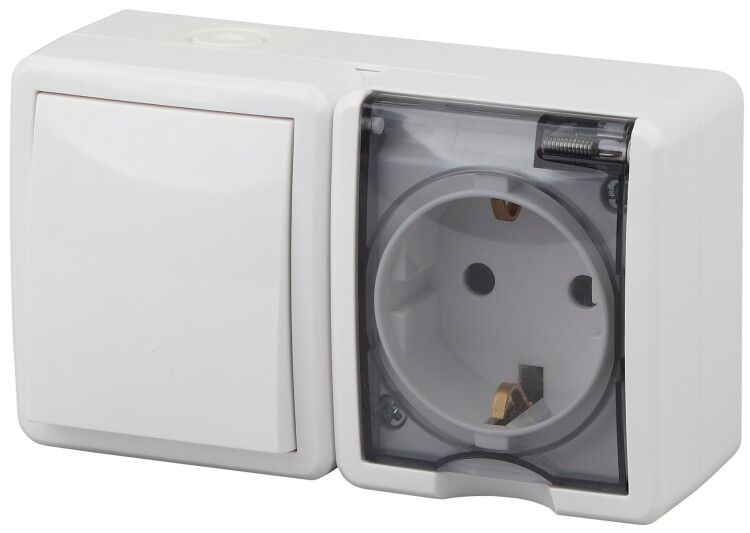 Блок розетка с заземлением и выключатель 1-клавишный 16А(10А)-250В IP54 белый 11-7401-01 предназначен для управления освещением и питания бытовых приборов в условиях, когда требуется поверхностный монтаж. Устройство применяется там, где нельзя или нецелесообразно устанавливать внутренние подрозетники - например, в деревянных домах, временных сооружениях, цехах, на улице под навесом, в подвалах или на фасадах зданий.