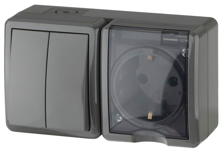 Блок розетка+Выключатель 2-клавишный 11-7402-03 IP54, 16АХ(10AX)-250В, ОУ, Эксперт, Серый (8/80/ | Б0020736 ЭРА